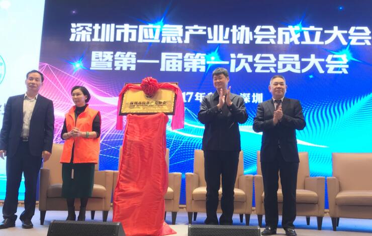 深圳市应急产业协会揭牌仪式,左起:深圳市应急产业协会会长杨北宸、深圳市应急产业协会荣誉会长吴银、深圳市人民政府应急管理办公室副主任阳杰、广东省应急产业协会会长方伟民