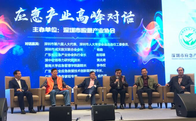 “应急产业高峰对话”,左起:深圳市应急产业协会会长杨北宸、深圳市减灾救灾联合会会长杨勤、广东省应急产业协会执行会长翁冠雄、深中欧领导力研究院院长黄兆奇、暨南大学应急管理学院副院长李伟权、广东省应急专家组专家俞祚福