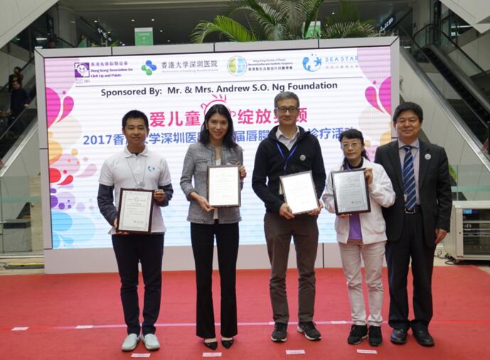 2017年11月24日,香港大学深圳医院第五届唇腭裂公益诊疗行动开幕式现场,港大深圳医院常务副院长王鹏飞为慈善团体和医疗团队颁发活动纪念牌,感谢他们对慈善公益活动的支持。(从左起,香港海星儿童基金会代表肖盾、香港Mr. & Mrs. Andrew S.O. Ng 基金会代表Ms. Karen Ng、香港整形及整容外科医学会代表李金合医生、香港兔唇裂颚协会代表朱阮淑仪和香港大学深圳医院常务副院长王鹏飞)