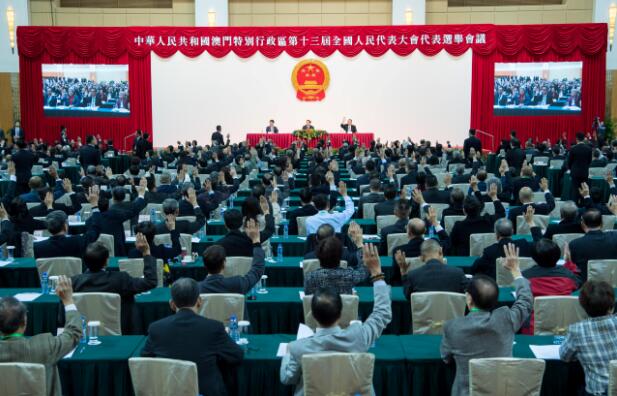 澳門第十三屆全國人大代表選舉會議第一次全體會議,與會代表舉手表決推選主席團成員。