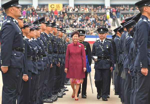 首次以行政長官身份出席警察學院結業會操的林鄭月娥致辭時,赞揚警隊維持香港法治、廉潔和治安,對香港的經濟發展有重大貢獻,每一位紀律部隊的成員對此都應該引以為榮。她提出要求:「要真正成為一支受人尊敬和受人愛戴的紀律部隊,仍然有額外的工作要做,就是關懷。」
