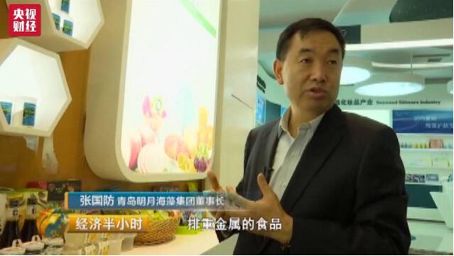 青岛明月海藻集团董事长 张国防:现在很多的排铅食品,排重金属的食品都用了我们海藻酸钠与重金属结合的原理。
