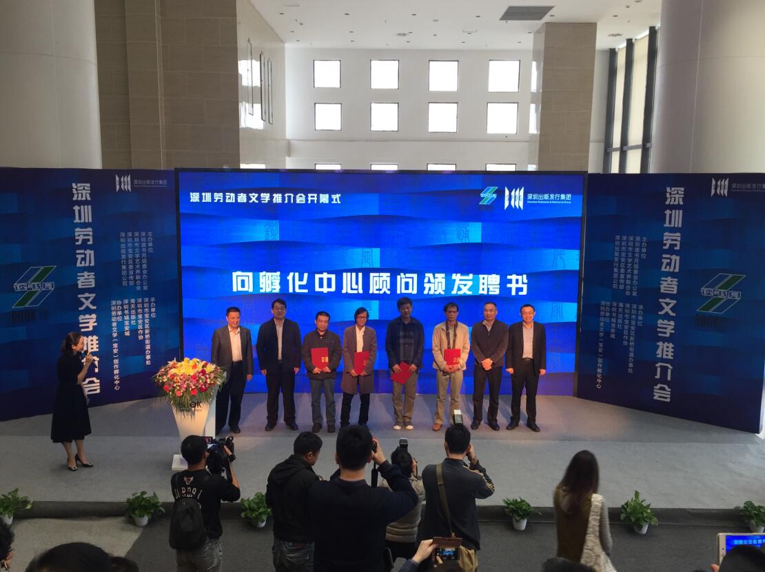 仪式上还邀请了粤港澳大湾区的城市文学代表,一同为粤港澳大湾区劳动者文学创作基地揭牌。最后,深圳劳动者文学(宝安)创作孵化中心还向邓一光、胡野秋、南翔、于爱成四位顾问颁发聘书。
