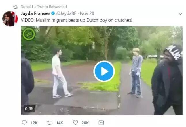 29日一早,特朗普连转3条“英国优先”党副主席弗兰森的推特。3条推特发了几段不同“反穆”视频,包括“穆斯林殴打拄拐杖的荷兰男孩”“穆斯林毁坏圣母塑像”。受到特朗普转推的“恭维”后,弗兰森立刻兴奋地在网上表示,“美国总统特朗普转发了这些视频,他有4400万粉丝,上帝保佑特朗普!保佑美国!”