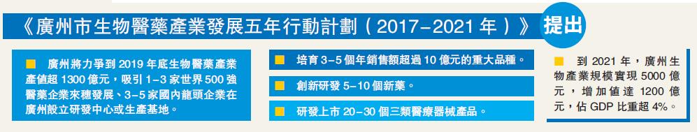 在IAB產業計劃中,生物醫藥產業行動最快。《廣州市生物醫藥產業發展五年行動計劃(2017-2021年)》提出,廣州將力爭到2019年底生物醫藥產業產值超1300億元,吸引1-3家世界500強醫藥企業來穗發展、3-5家國內龍頭企業在廣州設立研發中心或生產基地,培育3-5個年銷售額超過10億元的重大品種,創新研發5-10個新藥,研發上市20-30個三類醫療器械產品。到2021年,廣州生物產業規模實現5000億元,增加值達1200億元,占GDP比重超4%。