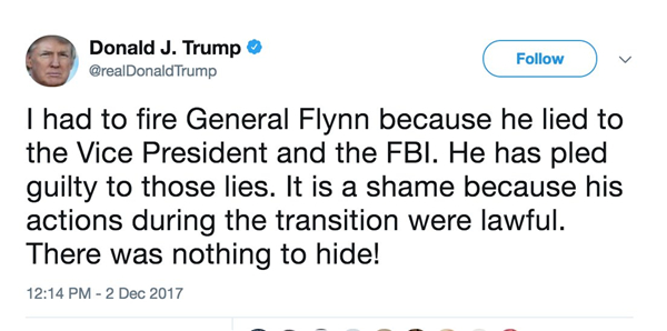 特朗普2日抵達紐約時,仍然向記者澄清沒有「通俄」,并稱對事情發展感到滿意。他隨后再在Twitter上「解畫」說:「我要開除弗林,因為他向副總統和FBI說謊。他現已就這些謊言認罪。這是可恥的,因為他在過渡期的舉動其實合法,根本沒有事情要隱瞞。」這段信息立即引起反對陣營注意。他們質疑,當特朗普要求FBI前局長科米放過弗林時,是否已知道弗林說謊?