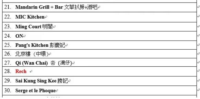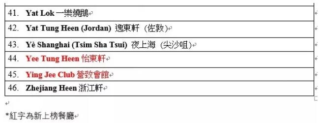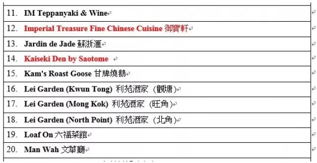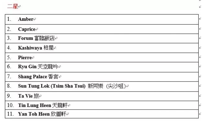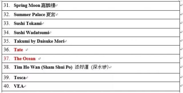 获得二星的香港餐厅有11间,另外还有46家一星餐厅,其中8家更是首度获此殊荣,包括西餐厅Arcane、Rech、Tate、The Ocean,高级怀石料理餐厅Kaiseki Den by Saotome,中菜餐厅御宝轩、怡东轩和营致会馆,当中主打日本法国融合菜式的Tate在搬店前亦曾获一星殊荣。