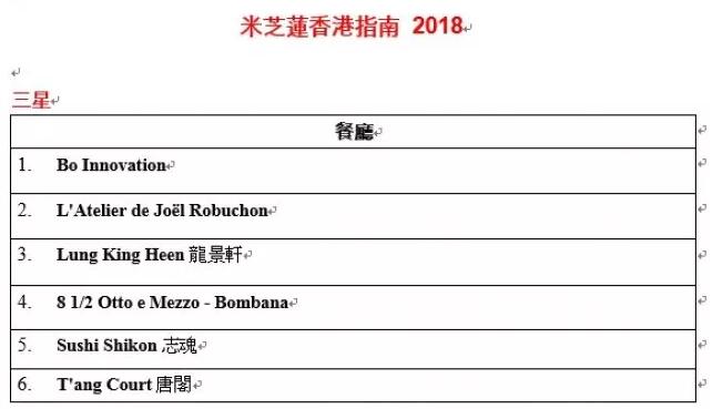 在最新的港澳米其林指南中,香港6间餐厅勇摘三星维持不变,包括“Bo Innovation”、“LAtelier de Joel Robuchon”、“龙景轩”、“8 1/2 Otto e Mezzo-Bombana”、“志魂”及“唐阁”,而位于中环香港四季酒店的中餐厅“龙景轩”则连续10年摘取三星。