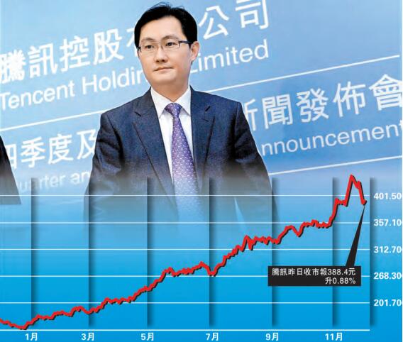 股王騰訊(700)在11月15日公布第三季業績,按非通用會計準則,純利達到170.7億元人民幣,按年升45%。期內收入升61%,至652.1億元人民幣,兩項數據都比預期好。受到業績比預期好刺激,騰訊股價從11月15日的383元,急升到11月21日的歷史高位398.60元,急升15.6元(4%)。騰訊帶動恒生指數由11月15日低位28851點,急升至11月22日的十年高位30199點,升了4.67%,1348點。由此看到,港股騰訊一股獨大,占恒指成分最高達到12%,主宰大市。