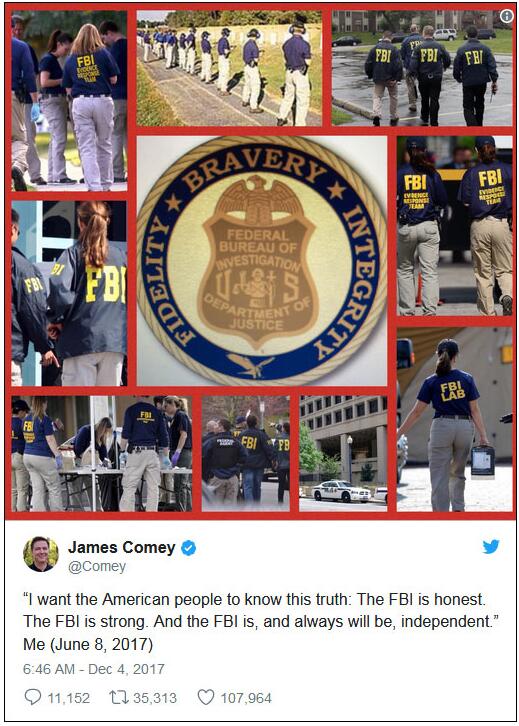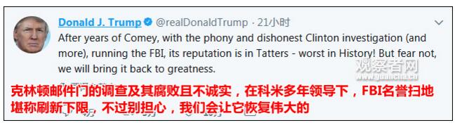 两天内屡屡被特朗普在推特上“点名”的FBI前局长科米也发推显示自己的存在感。