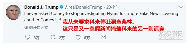 “我从未要求科米停止调查弗林。”只是更多的假新闻报道了科米的另一个谎言!”特朗普3日发推写道。