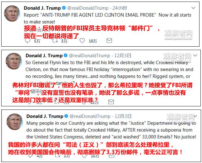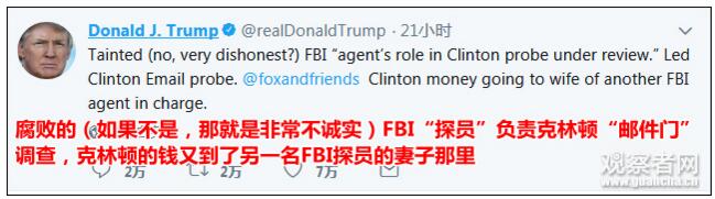然后是“主战场”推特。特朗普接连发布了数条火力十足的推特,猛喷“死敌”FBI部分探员、美国主流媒体以及希拉里。