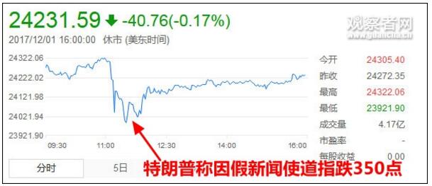 当地时间1日,美国前国家安全顾问弗林正式认罪,他承认就与俄罗斯大使会面等问题向联邦调查局提供虚假证词,并愿意配合FBI接下来的调查。几小时后,美国广播公司(ABC)又爆出一则“重磅假新闻”,称特朗普还是总统候选人时,指示弗林与俄罗斯人建立联系。消息一出,主流媒体纷纷转载,美国道琼斯指数短时间内下滑约350点。