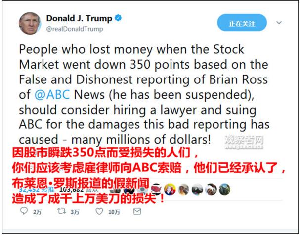 对于ABC,他更是在推特上发起号召,“假新闻”使美国道琼斯指数瞬跌350点,受到“好几百万”美元损失的股民们,告他们!