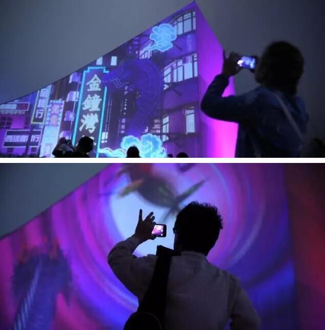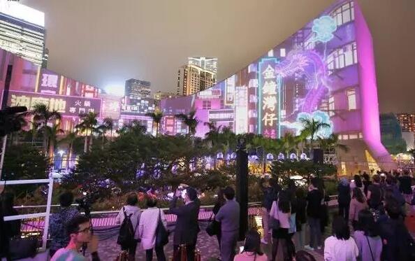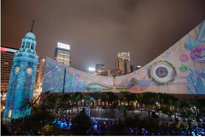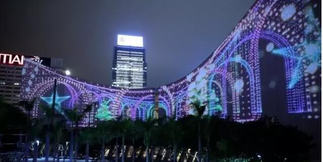 3D投影技术将瑞龙穿梭香港特色地标的画面展现在文化中心的外墙上