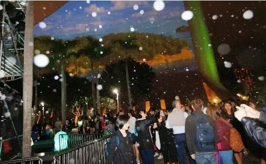 在汇演进行的过程中,露天广场还上演了“飘雪”特效,无数“雪花”纷纷落下,落在人们身上。而在喷水池摆放的一座巨型水晶球旁,不少游客拿着相机和自拍杆拍照留念。