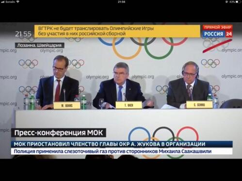 国际奥委会主席托马斯-巴赫在新闻发布会上说:“这是对奥运和体育运动完整性的一次前所未有的冲击。”同时, 他强调说,并不希望俄罗斯运动员抵制。“国际奥委会(执行委员会)在遵循正当程序之后,对这种系统性兴奋剂行为进行制裁,同时保护了清白运动员。与兴奋剂划清界限,并且成为世界反兴奋剂机构领导下更有效的反兴奋剂体系的催化剂。”