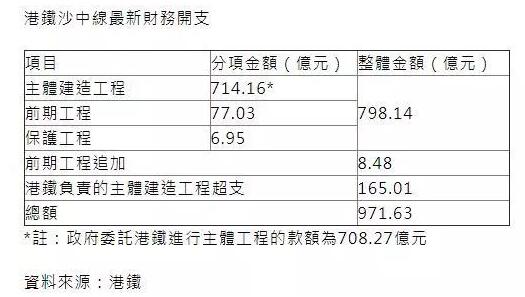 整项沙中线工程获立法会财务委员会通过的核准工程预算为798.14亿元,当中包括保护工程 6.95亿元、前期工程 77.03亿元及主体建造工程714.16亿元。政府委托港铁公司进行主体工程的款额为708.27亿元。其后在今年6月,财务委员会通过为前期工程追加 8.48亿元。因此连同最新估算超支165.01亿元,整体造价达971亿元。