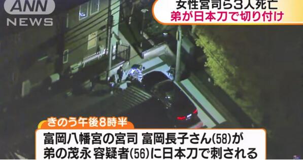 日本放送协会则报道称,担任东京神社女宫司的58岁富冈长子被其胞弟富冈茂永及一名女子斩杀丧命,同行的司机也受重伤。