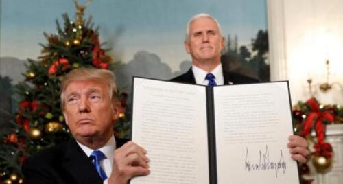 当地时间12月6日,美国总统特朗普在华盛顿发表声明,美国政府承认耶路撒冷为以色列首都,并将把美国驻特拉维夫大使馆搬迁至耶路撒冷。图为特朗普(左)与副总统彭斯(右)展示签名公告。