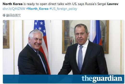 英国《卫报》12月8日报道称,俄罗斯外交部长拉夫罗夫向美国国务卿蒂勒森转达了朝鲜方面的信息称,朝鲜同美国就“核僵局”进行“直接对话”的大门是打开的,并且向华盛顿寻求安全保证。