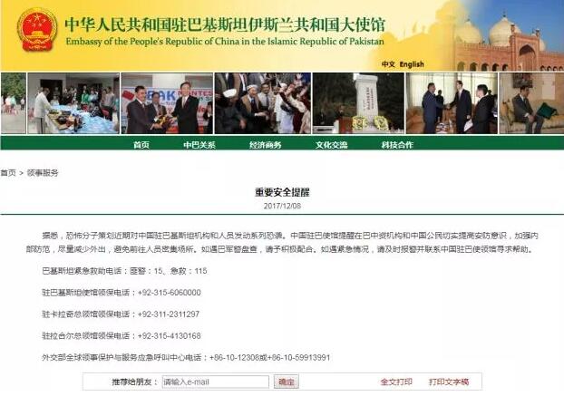 中国驻巴基斯坦大使馆8日发布“重要安全提醒”:据悉,恐怖分子策划近期对中国驻巴基斯坦机构和人员发动系列恐袭。中国驻巴使馆提醒在巴中资机构和中国公民切实提高安防意识,加强内部防范,尽量减少外出,避免前往人员密集场所。如遇巴军警盘查,请予积极配合。如遇紧急情况,请及时报警并联系中国驻巴使领馆寻求帮助。提醒通告还列出了巴基斯坦紧急救助电话、中国驻巴使领馆领保电话和外交部全球领事保护与服务应急呼叫中心电话。这则200多字的提醒引起中国人、在巴华人华侨及国际媒体的高度关注。