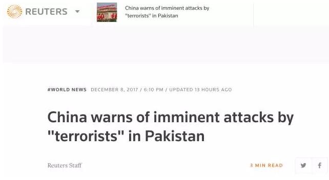 路透社:巴基斯坦是一个“被武装分子所困的国家”,中国长期以来一直担心“东突分子”与巴基斯坦和阿富汗的武装分子勾结,威胁中国社会安全。
