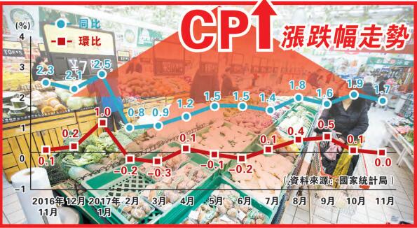 【香港商報網訊】國家統計局昨日發布數據顯示,今年11月份全國居民消費價格指數(CPI)環比持平,同比上漲1.7%,漲幅較上月回落0.2個百分點;工業生產者出廠價格指數(PPI)環比上漲0.5%,同比上漲5.8%,漲幅較上月回落1.1個百分點。專家分析認為,內地物價指數維持溫和上漲態勢,不過,由於年末菜肉需求增加,預計12月食品或重返升勢,對CPI上漲至2%以上形成支撐。