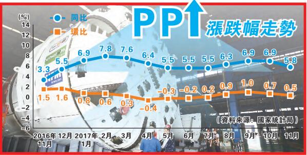 從環比看,PPI漲幅比上月回落0.2個百分點。生產資料價格上漲0.6%,比上月回落0.3個百分點;生活資料價格上漲0.1%,與上月漲幅相同。從同比看,PPI漲幅比上月回落1.1個百分點。生產資料價格上漲7.5%,比上月回落1.5個百分點;生活資料價格上漲0.6%,比上月回落0.2個百分點。數據顯示,1至11月平均,中國PPI同比上漲6.4%。