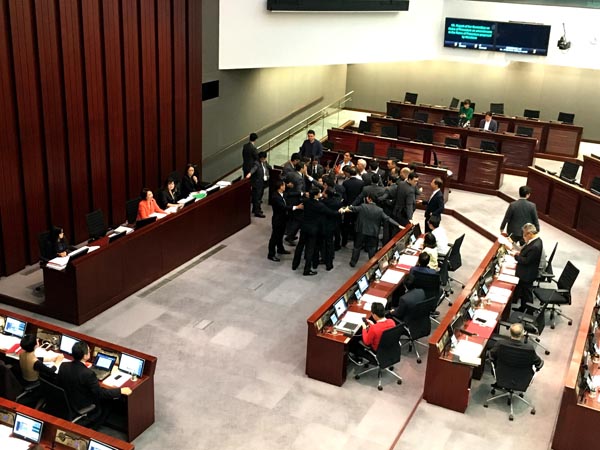 受累「拉布」,10月至今立法會尚未通過一項法案。圖為反對派議員冲擊主席台癱瘓會議進行。