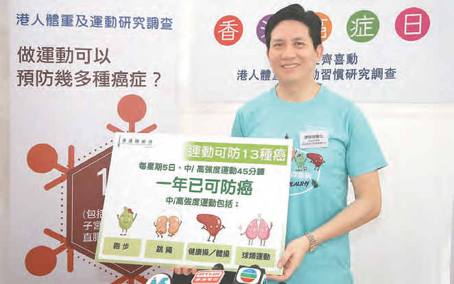 香港防癌會癌症教育小組委員會主席廖敬賢醫生指,運動可防13種癌症,同時有研究顯示一年中等程度運動已有助防癌。