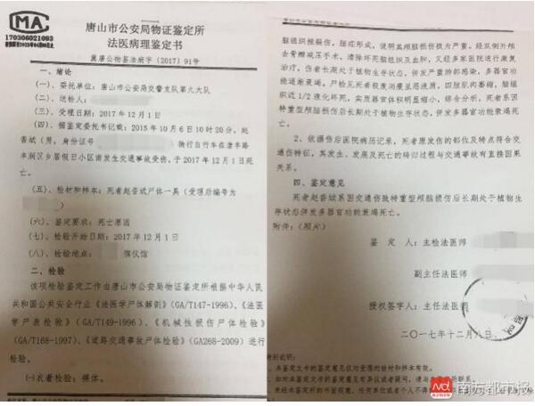 12月8日,接受尸检委托的唐山市公安局物证鉴定所出具法医病理鉴定书,鉴定意见显示:“死者赵香斌系因交通伤致特重型颅脑损伤后长期处于植物生存状态倂发多器官功能衰竭死亡。”