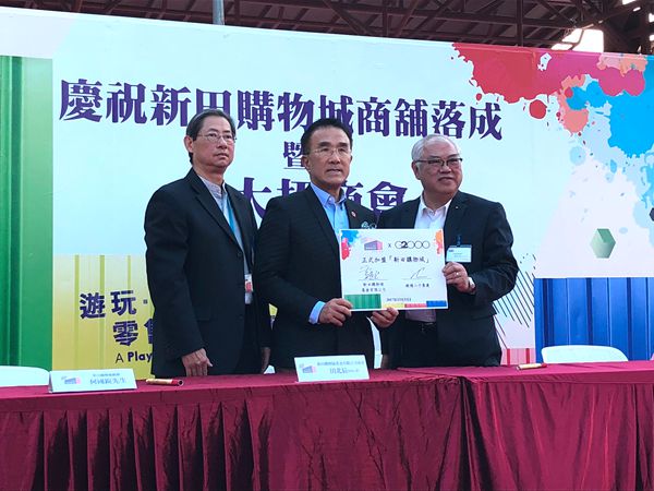 黃定光(右)與田北辰(中)簽署新田購物城租約。 記者 馮煒強攝