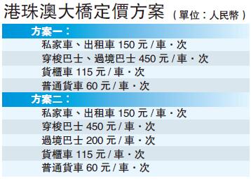 根據廣東省定價機關提出的兩個擬定方案,私家車、出租車均為每程150元人民幣,而貨櫃車則為115元人民幣、普通貨車為60元人民幣。至於穿梭巴士及過境巴士,兩個方案收費有所不同,方案一建議統一收費450元人民幣,方案二則把兩者分開,穿梭巴士為450元人民幣,過境巴士為200元人民幣。收費年限定為30年。