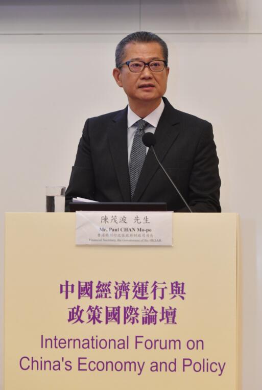 中國經濟運行與政策國際論壇由香港特區政府和中國社會科學院財經戰略研究院合辦,馮氏集團利豐研究中心和香港中國學術研究院協辦。陳茂波強調,憑藉「一國兩制」的獨特優勢,十九大報告提出的持續深化改革、推動創新發展的大方向,將會為香港經濟及創科發展帶來龐大的機遇。他續稱,在國家「一帶一路」倡議和「粵港澳大灣區」發展戰略上,香港會積極與各界攜手把握未來的龐大機遇,從而為香港經濟和社會發展注入新動力。