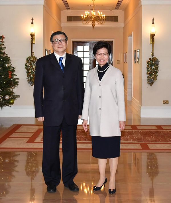 【香港商報网訊】行政長官林鄭月娥(右)昨日下午在禮賓府與中國社會科學院院長王偉光(左)會面。林鄭月娥歡迎王偉光訪港,出席中央政策組與社科院財經戰略研究院昨日主辦的「中國經濟運行與政策國際論壇」,論壇為內地、海外和本港各界人士提供平台,分析內地經濟的運行狀況和未來的政策取向,以及香港的角色和機遇,吸引了300多人出席。