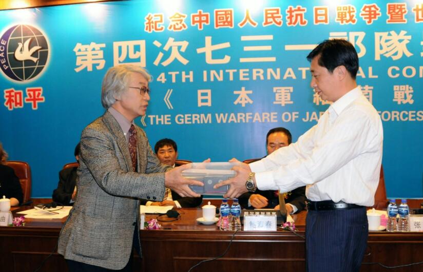 2008年9月18日,在哈尔滨举行的第四次731部队罪行国际学术研讨会上,日军侵华战争历史学者森正孝(前左)向哈尔滨市社会科学院代表捐赠自己近30年来对731问题调查采访的珍贵资料。徐宜军 摄