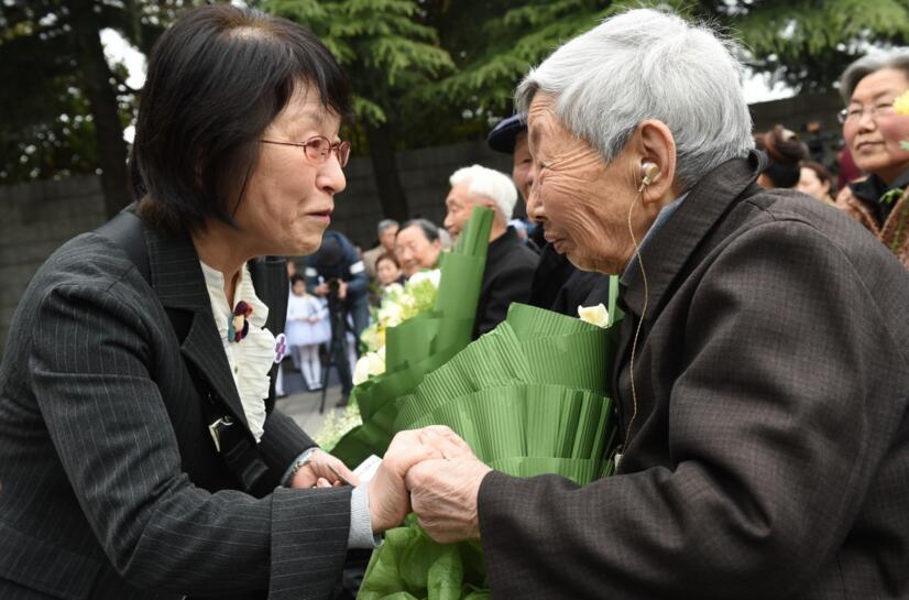 2016年4月4日,南京大屠杀历史学者松冈环(左)在南京参加祭奠活动时与南京大屠杀幸存者杨翠英交流。韩瑜庆 摄