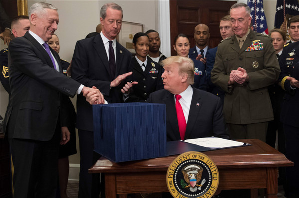 特朗普(前右)在簽署總額約7000億美元的2018財年國防授權案後與國防部長馬蒂斯握手