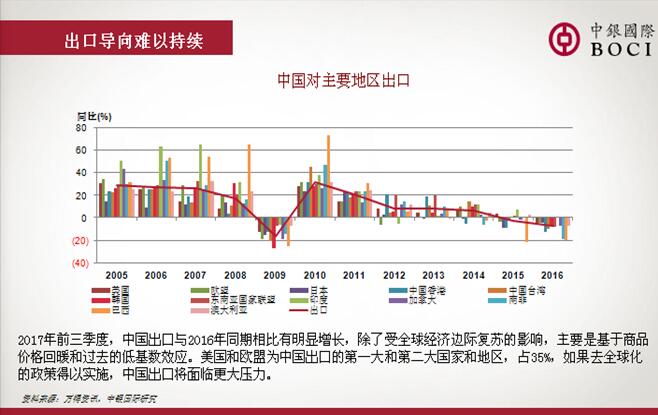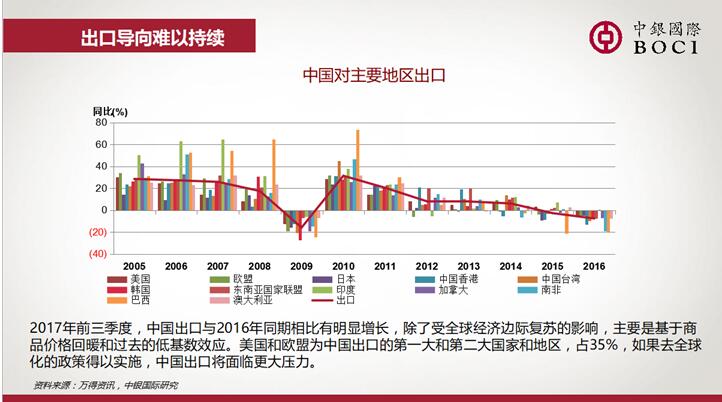 首先是世界經濟不像我們過去理解的高速增長。中國出口導向性經濟模式必須轉向內需擴大。2010年是出口增速最快的年份,當年出口增速高達30%,從那以后一路下行,到了2015年出口已經是負增長,出口不再是中國經濟的主要貢獻,而成為中國經濟的拖累。今年中國出口表現不錯,又恢復到兩位數,1—10月份達到11%。但是是否可持續,仍具有嚴重的不確定性。10月份中國的出口增速跌到6%左右。與此同時,歐盟跟美國依舊是我國第一個第二大的出口目的地,這兩個加起來占中國出口份額的35%,如果加上日本超過40%。而我們知道歐盟和美國又是對中國貿易歧視最嚴重的地區,如果他們的貿易保護政策得以實施,對中國出口會造成很大的影響。