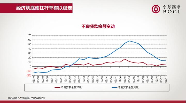 隨著根據供給側結構性改革的推進,企業利潤的回升和現金流的轉好,企業的還本付息能力提高,杠桿率有所下降,壞賬率也隨之下降,于是出現金融系統性風險的概率也在下降。