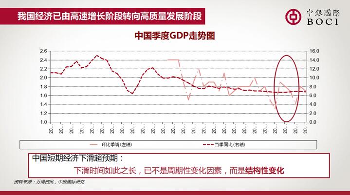 目前中國經濟步入新階段,中國經濟增長高點是2010年的第二季度,到現在已經持續25個季度增幅下行。我做中國宏觀經濟將近40年,從未見過這樣的場景。目前中國經濟不是下行的速度多快,下降幅度多大,而是下行時間如此之長超過預期。為何中國經濟下滑時間如此之長?