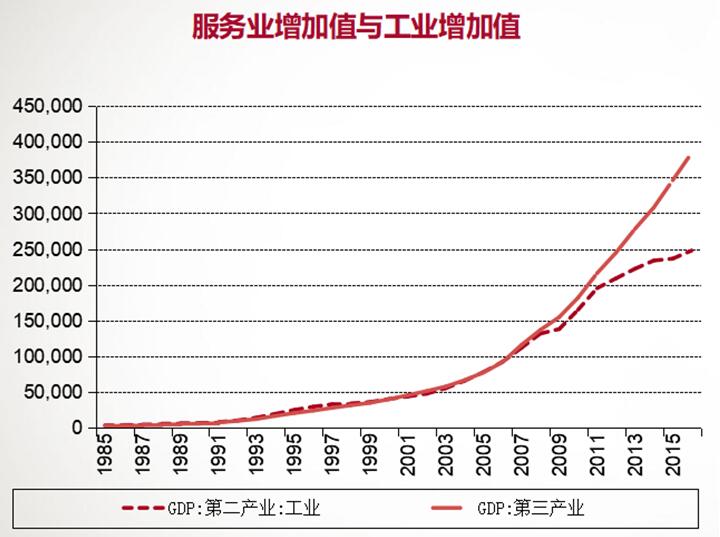 服務業在十一五期間沒有完成任務,盡管中央政府要求服務業的增長速度要快GDP兩個百分點,但最后依然沒有完成。2013年中國的服務業第一次超過工業成為中國第一大部門,到去年中國的服務業占GDP比重將近52%,預計在未來三年中間輕松超過55%接近60%是完全可以的。