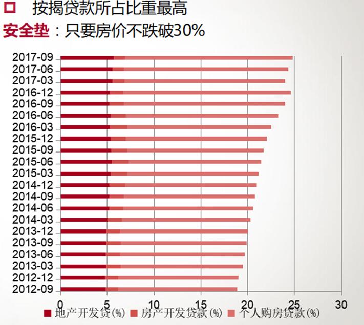 現在銀行壞賬的風險點更加集中于房地產泡沫。中國的房價漲得太快,漲得太猛。如果房價突然下跌,會導致銀行的壞賬率上升,曾經導致美國金融危機的原因就是按揭貸款還不起。根據數據統計,銀行業資產25%-26%與房地產相關,然而其中只有6%是跟房地產開發貸款相關,其余的20%都與按揭貸款有關,從而人們擔心按揭貸款一旦斷供,這會導致很大的問題,深圳在2009年出現過斷供。而海南在本世紀初也出現過房地產的泡沫破裂。造成銀行壞賬,海南發展銀行因此倒閉,但是我們認為中國不會出現類似美國的次貸危機,原因很簡單,中國沒有次貸。