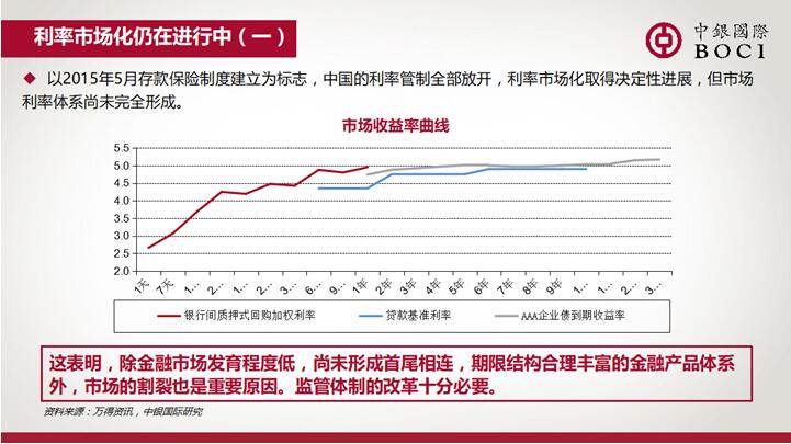 根據中國的實際情況,會發現金融混業經營已經在形成,市場需要穿透。互聯網金融雖然有很大的問題,但是它穿透了中國的貨幣市場、信貸市場。當年馬云配合淘寶與支付寶積攢了大額的資金,然后和銀行簽協議存款,進入了銀行間市場。但是互聯網需要監管,支付問題是一手交錢一手交貨,存款卻是期限問題,存款存一天也行,存兩天也行,終究需要一個準確的期限,但是支付不能保證期限。比如說明天就是雙十一了,突然爆發性的交易,需要及時支付,支付寶就要從銀行大量提存,就會產生擠兌風險,這也解釋了為何支付到達一定額度后就一定要經過銀行。余額寶產生的利息終究是銀行存款的利率產生的,是從貨幣通到信貸市場。于是銀行隨之退出各種貨幣寶,短端市場和信貸市場利率變動趨向一致。銀行理財也是一種影子銀行,從正面理解,它是在一級市場完成的發行,在二級市場發生轉賬。從而這個現在一半在資產負債表一半不在。國債收益率曲線是無風險收益率曲線,是政策利率制定的依據,但曲線不平滑不完整,意味著政策領域沒法傳達。