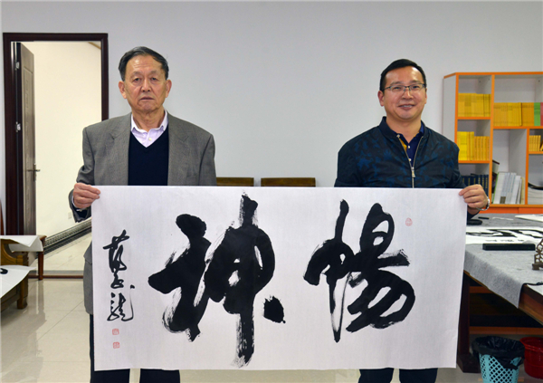 采风团团长蒋子龙(左)为观音山国家森林公园 题词。