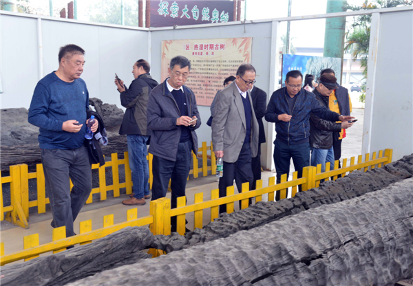 采风团作家们在观音山古树博物馆参观千年碳化树。