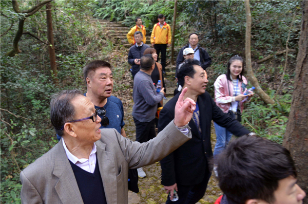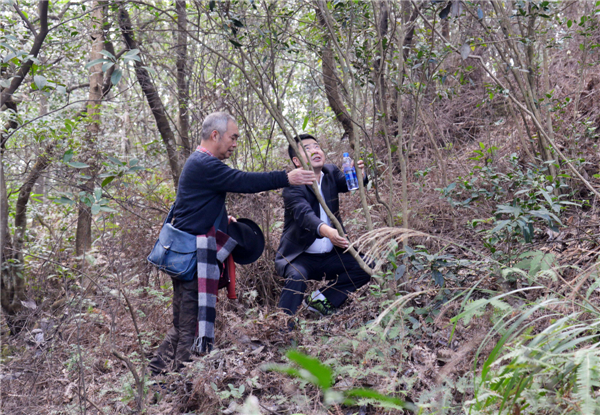 采风团作家王炳根(左)在观音山上勘查百年山茶树。