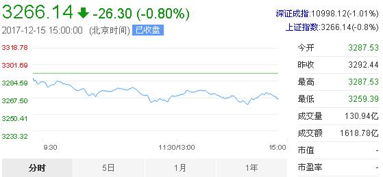 12月15日消息,沪深两市早盘双双低开,随后维持调整态势,临近午盘时股指小幅跳水。下午开盘后沪指有所反弹,但成交量并未放大,临近收盘沪指有所拉升,周线上看沪指已周线5连阴,截止收盘,沪指报3266.15,跌0.8%,创指报1783.97,跌0.58%。