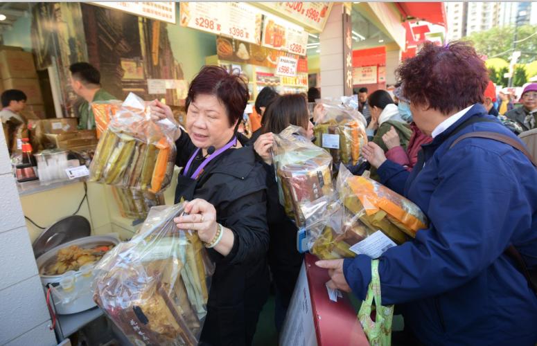 及後,林鄭月娥開始「購物之旅」,到多個展銷攤位與店員傾談並試食。期間,不時有場內人士高喊「林太你好」,林鄭月娥朝他們揮手微笑,又與店員合影留念。最後,她購買了蝦子麵、臘腸、臘肉等食物,共花5550多元。